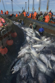 Bluefin Tuna Mattanza in the Atlantic Ocean waters off Zahara de los Atunes in Spain. This method of fishing uses a system of nets called an Almadraba has been used in this region for over 3000 years. The nets trap the bluefin tuna as they migrate out of the Mediterranean Sea where they spawn. When enough fish are in the final chamber of the nets they hold a Mattanza (harvest).