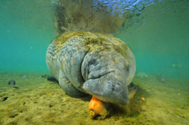 A Florida Manatee (Trichechus manatus latirostris) eating a carrot in Homosassa Springs State Park in Homosassa, Florida. This park has 6 captive manatees living in a natural sectioned off portion of the Homosassa River. The animals were brought here to be rehabilitated after receiving injuries.