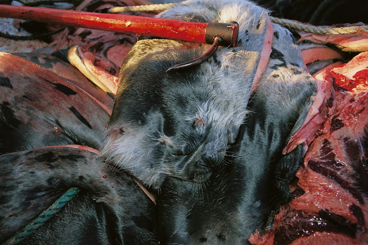 A hakapik lies across a pile of harp seal pelts