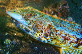 A Lizardfish eats a small wrasse on the sandy bottom of Suruga bay, Osezaki, Japan. Izu Peninsula.
